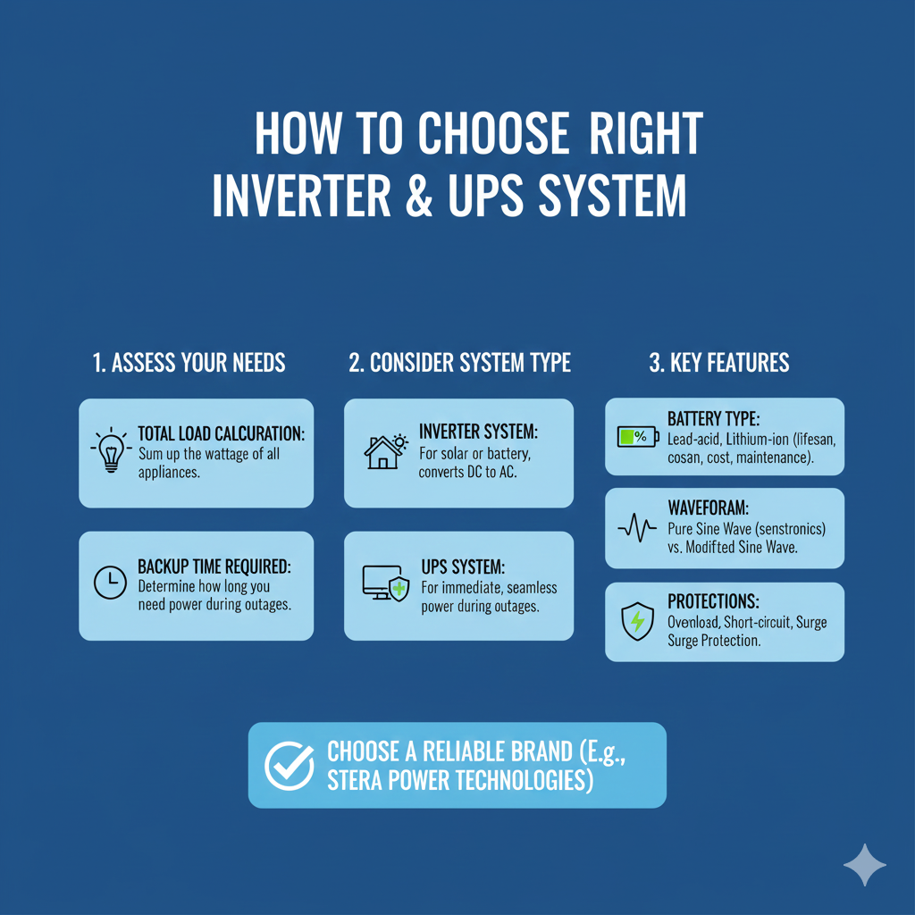 Choosing the right inverter and UPS system can be challenging with so many options available. Here’s a simple guide to help: STERA Power Technologies can help you select and install
