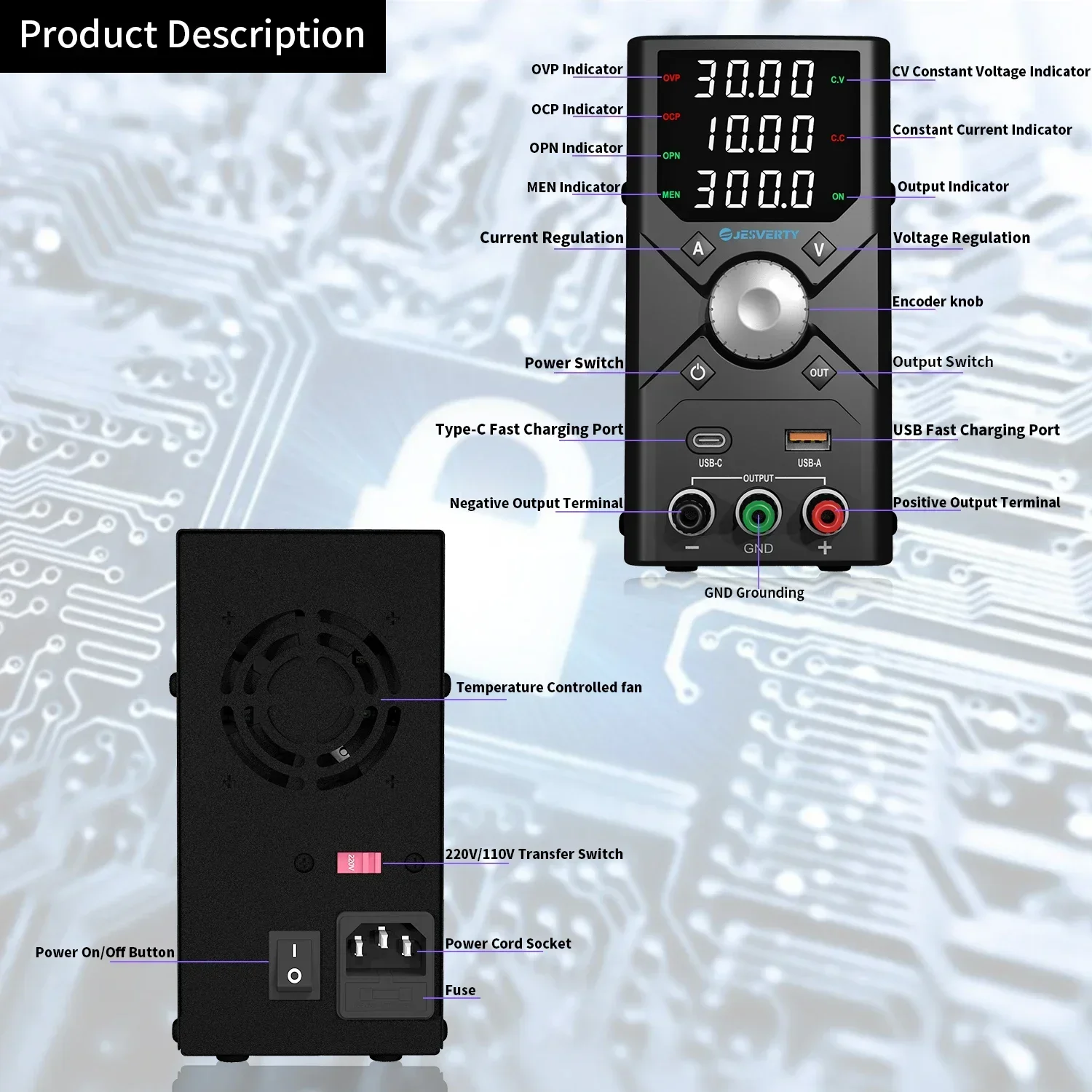 The Adjustable DC Power Supply is a state-of-the-art laboratory power supply designed for precision and versatility. With a four-digit LED display, it offers high precision voltage, current, and power readings, ensuring accurate measurements for your experiments or repairs. The power supply is encoder regulated, which means it maintains a stable output voltage and current, even under varying loads. This feature is particularly important for applications that require a constant power supply, such as electroplating, titanium oxide, or electrolysis processes.